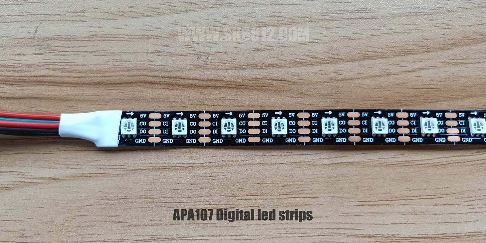 Addressable RGB Pixel APA107 LED Strips, 60 Pixel LED Strip, with DATA and CLOCK Separately, 60led/m, 60pixles/m, DC5V, 18w/m, 10mm white/black FPCB, IP20 or the other waterproof grade, 5m/roll, with 3M adhesive tape backed, a real product which can replace APA102/APA102C.